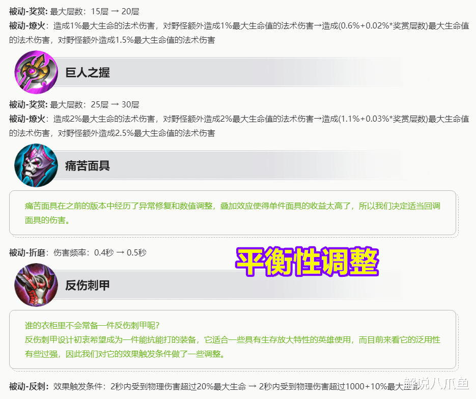 首先是打野刀的调整,巡守利斧及巨人之握,也就是紫色打野刀,这件装备可以说是直接的削弱,原本被动分别是15层和25层,但是现在调整为20层和30层,为什么增加层数反而说是削弱呢?