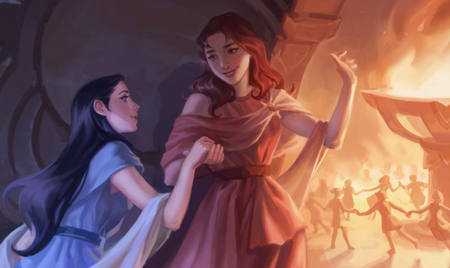 这篇小说名为“同我上升”,故事的封面就是黛安娜和蕾欧娜两个的年轻模样。故事讲述了孩童时代的两人,在同一个地方学习,蕾欧娜是三好学生,而黛安娜则是离经叛道。她们都是烈阳教派的成员,认为太阳是正义的,月亮是黑暗的。黛安娜有着不同的看法,她认为有光就有暗,这使得黛安娜在学校里有很多人歧视,她受到了孤僻。基本上,同龄人只有蕾欧娜敢接近她的身边。