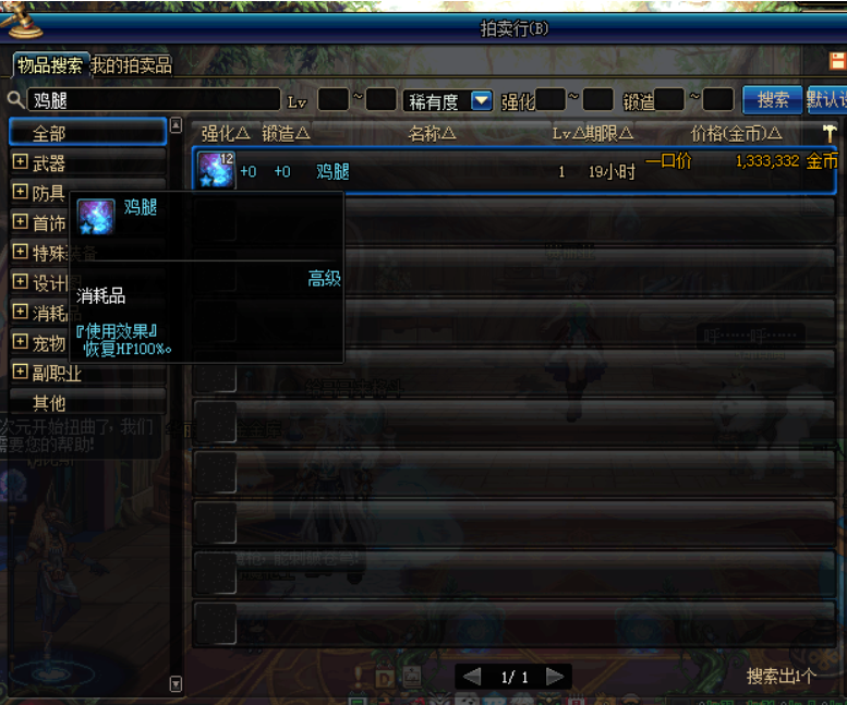 在DNF的拍卖行总能发现各种惊喜,就算是一些地下城不存在的道具可能都能在拍卖行搜索到。记得之前拍卖行还能搜索到GSD的究极波动刃,可惜搜索之后并不存在。而还有个神秘的药水在拍卖行也是可以搜索的,大家能在拍卖行搜索到鸡腿。