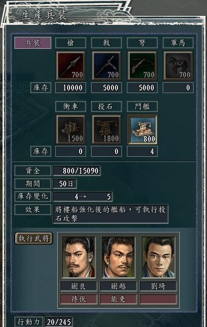 下面是有“练兵所”的情况,一样属性的三个武将,造一艘“斗舰”需要30天,也就是3个回合。