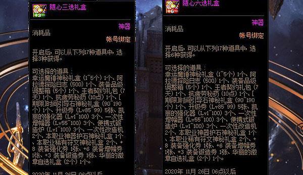该礼包一共分为2款,一种可以在17种道具中任选6种,礼包售价1666点券,而另一种则是在17种道具中任选3种,礼包售价466点券,两款礼包同为限购一次,礼包内包含了各式各样的道具供小伙伴们选择,其中还有+8强化券、+6增幅券、5张升级券等等,整体来说礼包的性价比还是比较不错的。