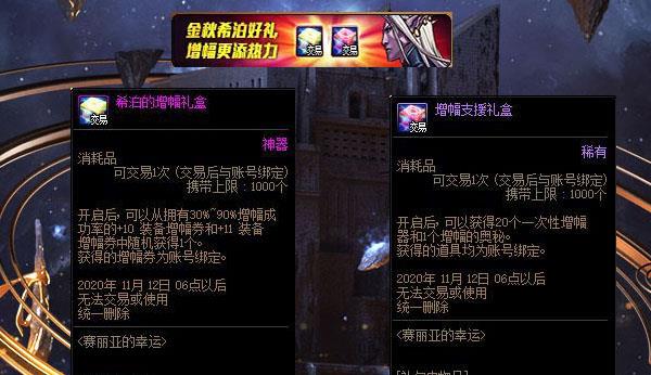 魔盒限定道具在10.15日更新后进行更换,此次魔盒重新上架了“希泊增幅礼盒”与“增幅支援礼盒”,两款道具都可交易,希泊增幅礼盒打开后可获得+10增幅券(30%~90%几率)或者+11增幅券,支援礼盒打开后可获得20个一次性增幅器,这两款道具时今年第二次加入魔盒了,从最近更新的内容可见策划一直在送出与增幅相关的道具,玩家的增幅强度也是越来越高,红10已经慢慢成为普通玩家的标配,然而在更新魔盒之前如果有需要天2的小伙伴要抓紧时间了。