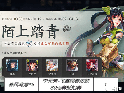 清明节的活动,通过排位、组队收集春风鸢意信物可以兑换40陆贞传奇高湛宠幸阿碧了吗0铭文碎片、永久自选英雄宝箱、80点券李元芳飞鸢探春皮肤抵扣券其中之一,至于如何选择,80皮肤点券折扣券优先,这个数值的点券也说明李元芳的清明节皮肤飞鸢探春是史诗级。