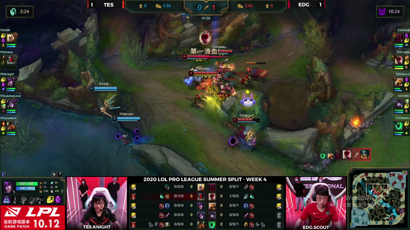 昨天TES大战EDG的比赛可谓是精彩纷呈。一个是由明凯指教的EDG,另外一个是最近势头正盛的MSC冠军TES。两个顶尖强队的碰撞直接将昨天的BO3拉满,第一局比赛EDG先驰得点,凭借最后一波团战先手把阿水给秒掉随后一波推掉了TES的基地。但第二把,TES立马还以颜色将比分拉成了1:1平手。比赛进行到最为关键的第三局。