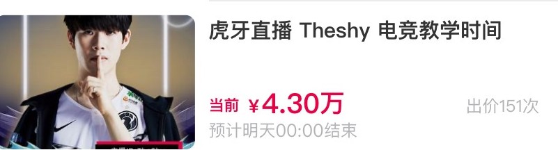 iG上单选手TheShy的竞拍金额在一轮轮角逐之后来到了惊人的43060元。注意,此次活动出售的只是1小时的陪练、教学时间。不过可以和shy哥亲密连麦,还能被世界第一上单指点操作,这对于喜欢TheShy的老板来讲,也可以说是值回票价了。毕竟TheShy是iG的牌面之一。