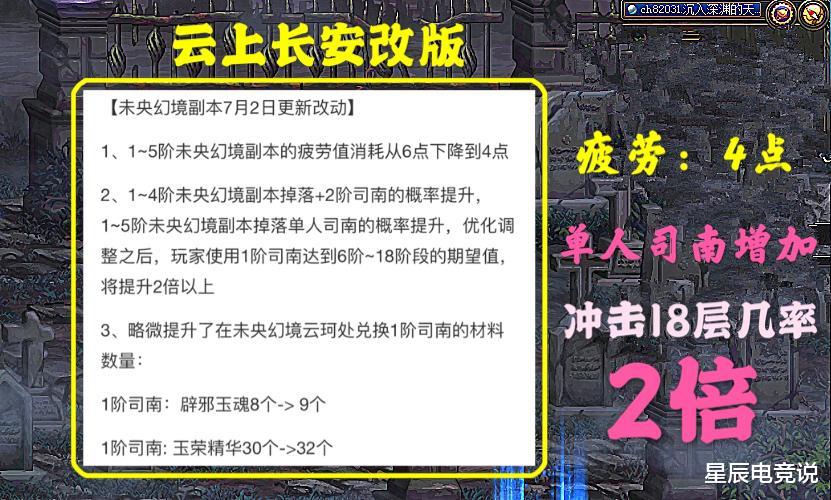 改版后的第一天,云上长安副本再次火热起来,1-5阶由6疲劳减少为4疲劳,1-5阶大幅增加单人司南掉率,玩家获取6-18级高阶司南的可能性提高2倍!个人实测了10张司南,已经爬到9阶了,目前在凑玉荣力,继续往上爬,这在改版前是不敢想象的。