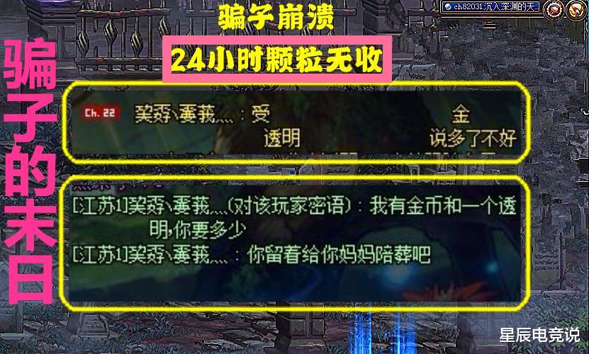 与此同时,各种高级组队司南价格下跌,也没人敢收钱就跑!不仅如此,各种收金、代刷深渊的骗子喇叭基本绝迹,因为这样的喇叭一出来,就会被玩家直接举报!不过还是有骗子玩家不甘心,跨五的一个骗子,从开服到现在,一直在喇叭喊话,“受金、透明、说多了不好”,有玩家去调侃了他一下,“我有金币和透明,你要多少?”,如果在以往,骗子绝对是极度热情,各种秀优惠,但这一次,受到官方打击,骗子心态崩溃,行骗一天,喇叭刷了无数,却是颗粒无收,绝望的骗子直接开启了“骂街”模式。