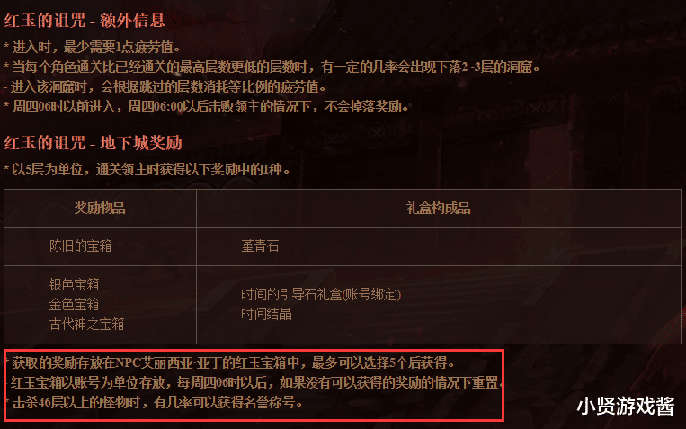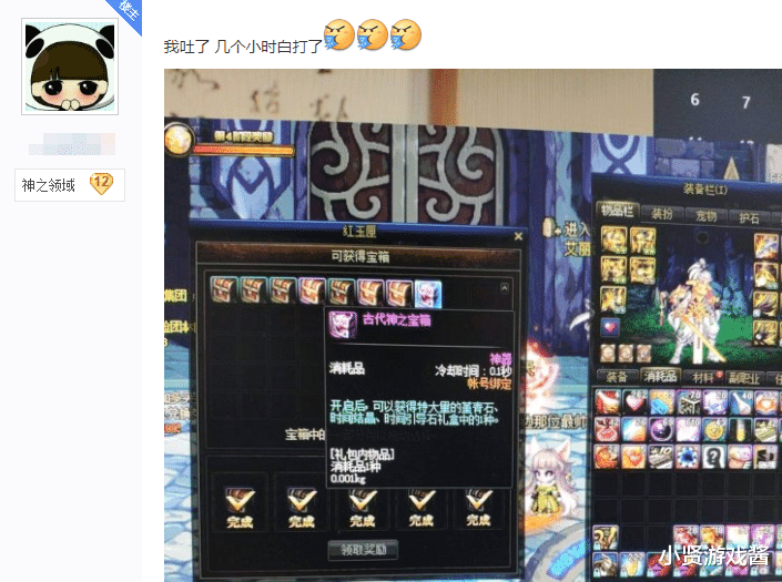 对于这个副本玩家在刷之前想象都了解过他装备需求以及奖励获取条件,装备一身普雷就可以了,获取奖励的条件则是在副本中获得的宝箱中选择5个进行领取,待到周四所有宝箱进行重置,但是在近日有一位玩家却白打了,他以为每个号都能领取一次,所以先给小号领取最垃圾的宝箱,但是在打到40层之后才发现之前获得的宝箱不能领取了,也就是说这位玩家白打了几个小时了。