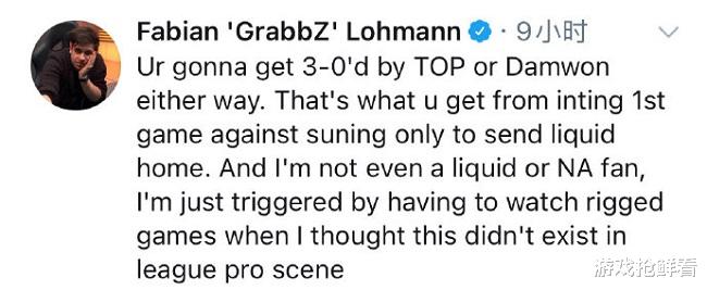 最终G2也是连续两场不敌SN,没能让苏宁战败,G2也没能以小组第一的名次出线,因为苏宁战队在最后对决G2的两场比赛中都表现的非常好,两连击败导致苏宁完成了反转,从晋级边缘去到了小组第一,而欧美观众希望看到TL跟G2携手晋级,所以对G2有很大的期待,没想到G2两连败给SN战队,这也让欧美观众非常的生气,有网友直言G2第一局是故意输给苏宁战队的,才会导致TL战队止步十六强。