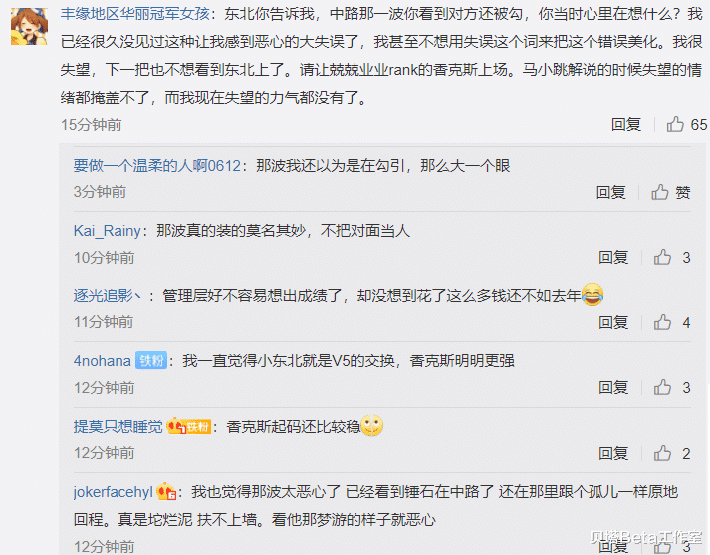 在WE官博下方,被喷得最惨的就是中单小东北了。他在这场BO3的两场比赛都发挥不佳,而在第二局中,他的佐伊有一波看到对面锤石的情况下,自己装过头被钩到,打出梦游般的操作,引发了大量粉丝的不满。