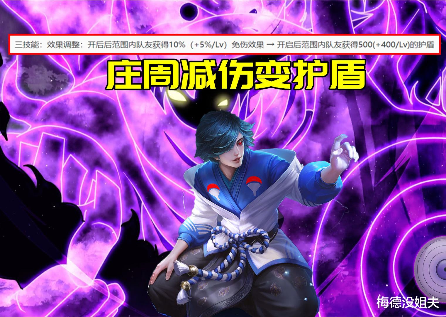 庄周作为一名老牌英雄已经逐渐跟不上版本节奏了,其整体胜率、出场率相较其他辅助而言要低出了一个档次,实战中也经常给人一种很混的感觉。究其根源还是在于庄周本身缺乏控制,且对于己方大哥的增益效果也不甚明显。因此本次更新,将庄周大招的效果由提供10%~20%减伤改为了增加500~1300点护盾,试图让庄周能像其他辅助那般起到保护后排的作用。