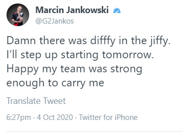 比赛结束之后,G2打野就发推表示:该死的,明天开始我要加紧训练了,谢谢队友带我飞。