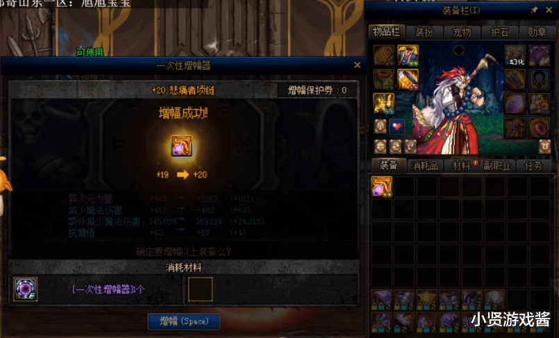 对于这个增幅19的坎坷项链,号主也是在一次脱坑的契机下获得的,原本打算碎完装备就脱坑,但是没想到在增幅这件项链的时候像打不死的小强一样一路飙升到19,而在增幅到19之后号主也是停手了,想找到一个值得去增幅他的人,而这个人就旭旭宝宝,在谈好2000块钱的价格新开传奇私服1.95之后,旭旭宝宝也终于有了一次冲击20的机会。
