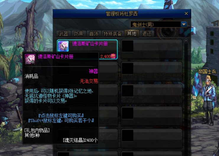德洛斯矿山卡片册,玩家都比较有印象,在NPC“杜罗西”处,就能够用魂灭结晶材料兑换。不过,该卡片册有局限性,没有“典藏”两个字,只会出记忆之地和无底坑道怪物卡。这两个副本中的卡片,在属性附魔上属于次顶级,拍卖行并不贵。
