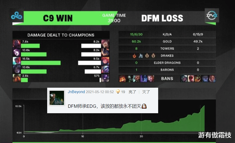 之前DFM战队给观众带来不少惊喜,但观众的高期待反而让他们有点放不开,打法变得很奇怪。前期DFM佐伊拿到一血和蓝BUFF取得巨大优势,但他面对永恩无法发力。而绝食流腕豪拼死想压赛恩,却把自己搞炸,经济差得像个辅助,居然还敢去找永恩单挑,把全队都带崩了。后期DFM队员心态炸裂,被对面亮标秀白旗嘲讽,却不敢出来应战,龙魂大龙高地水晶全都放掉,等死打法太难看,网友怀疑他们师承EDG!